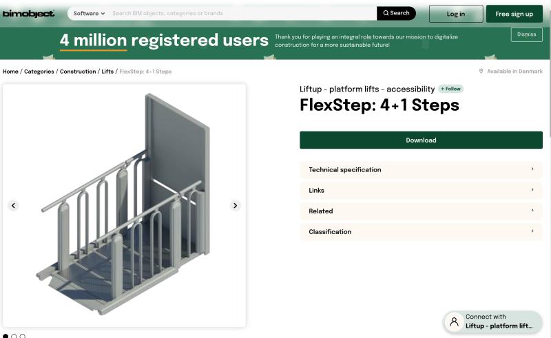 Architects can search for FlexStep and EasyLift lifting platforms and implement the 3D models in their project (except for HDN, that is not included).