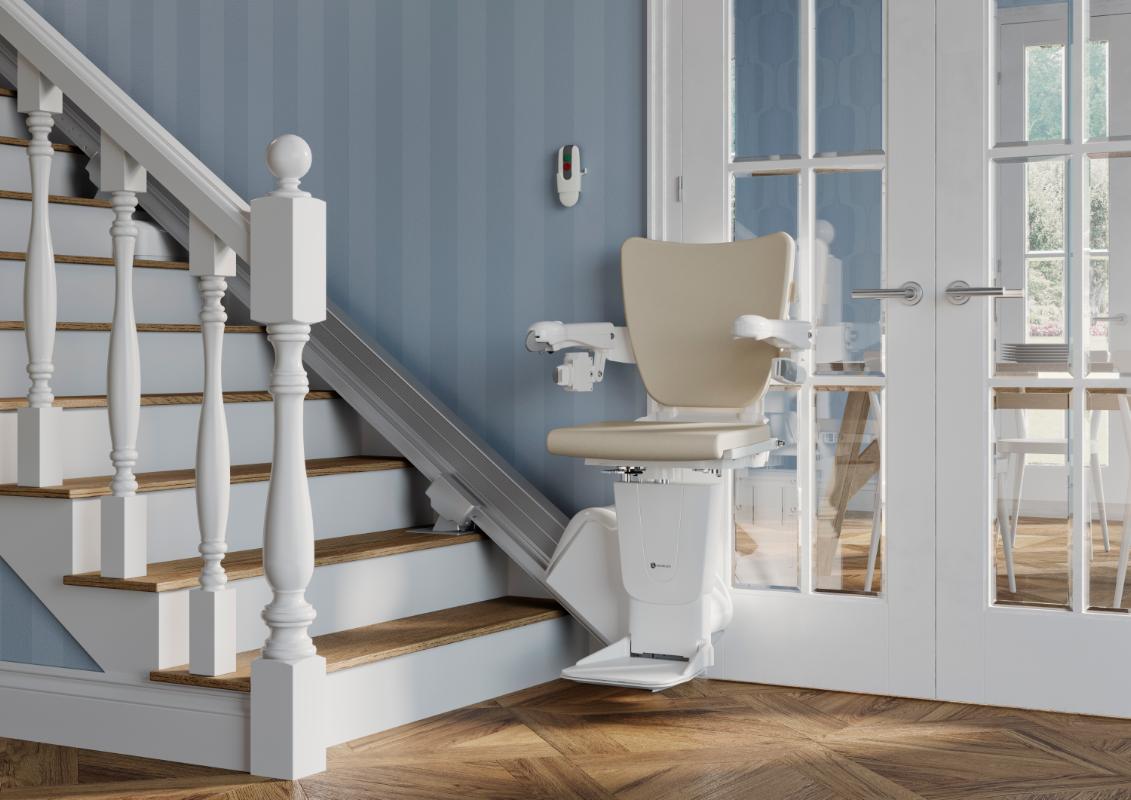 Ligeløbstrapper, indendørsHandicare 1100 er en opgraderet stolelift med et strømlinet design, som har det smalleste skinnesystem på markedet. Med det patenterede Multi-Drive System kører denne stolelift altid optimalt.