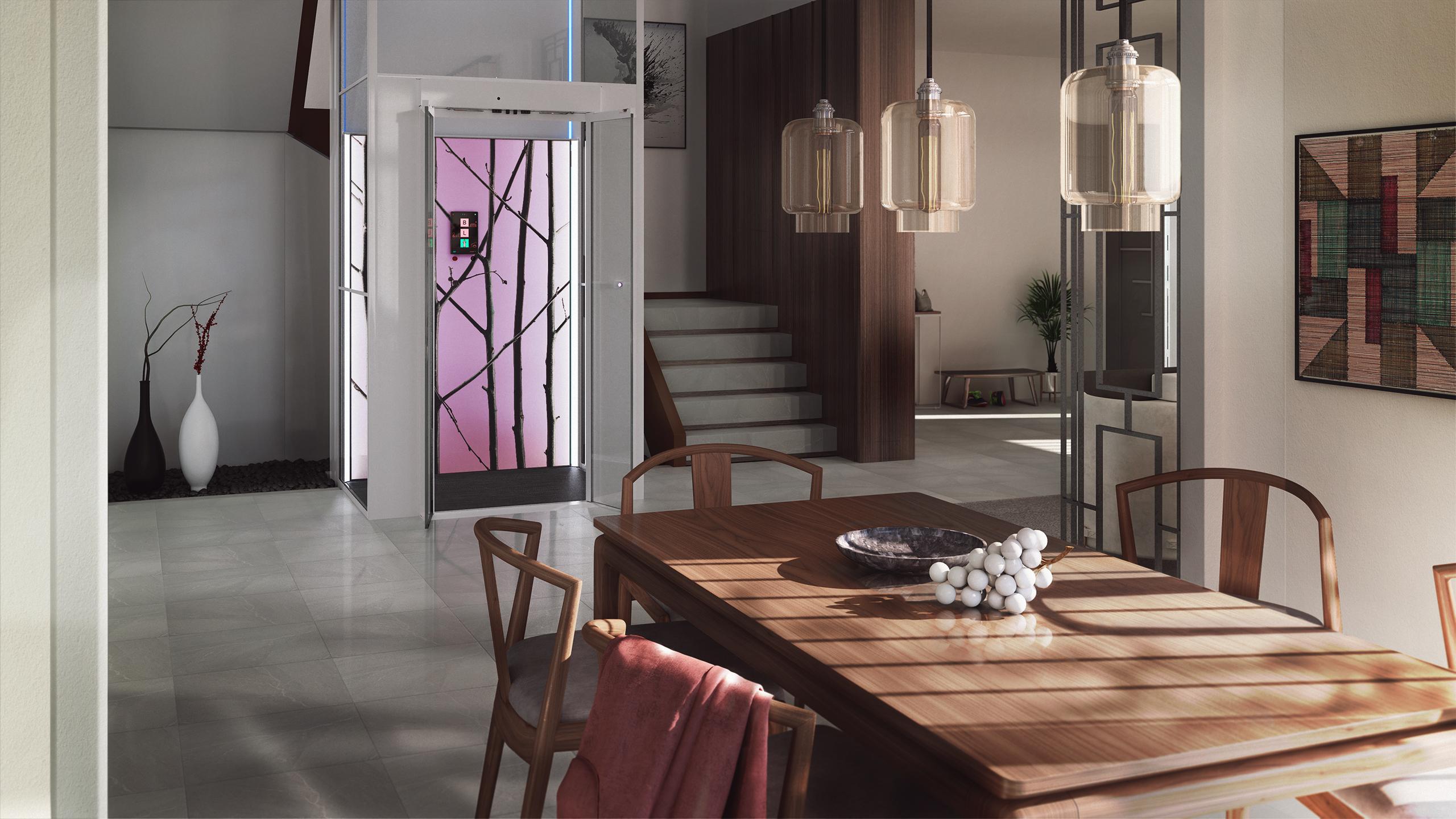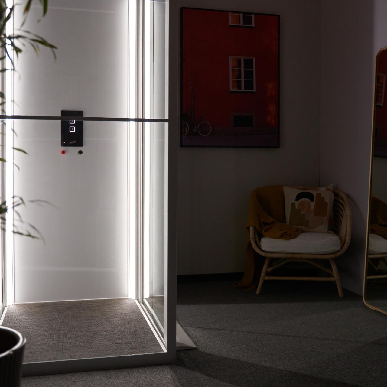 Udformningen af platformsliftens skakt og interiør vælges i materialer og farver, som tilpasses dine ønsker og behov. Swift Pro har også indbyggede LED lys med ekstra bagbelyste ArtWalls. Det er dekorative installationer, som let kan udskiftes, så nye udtryk kan tilføjes regelmæssigt.