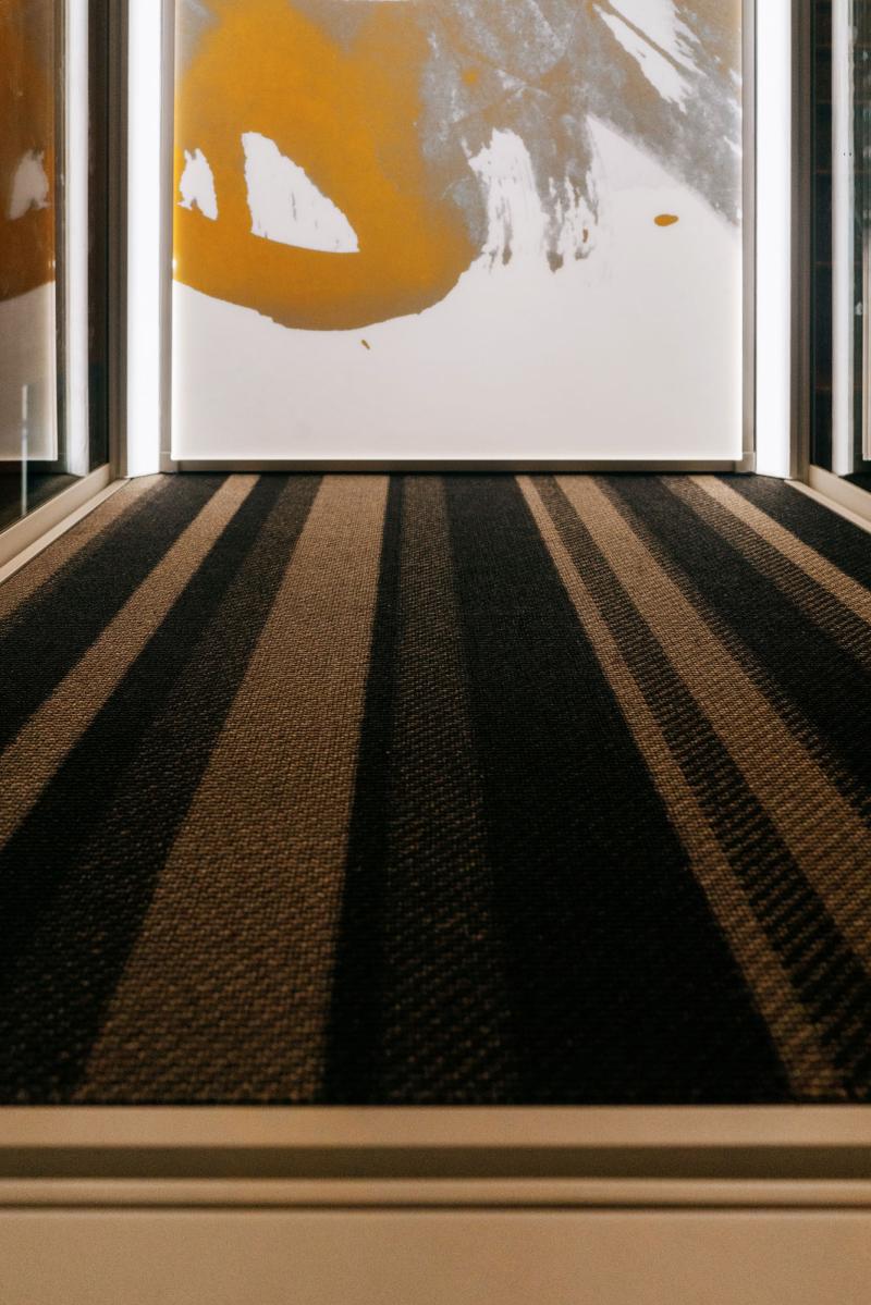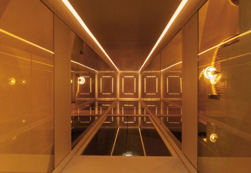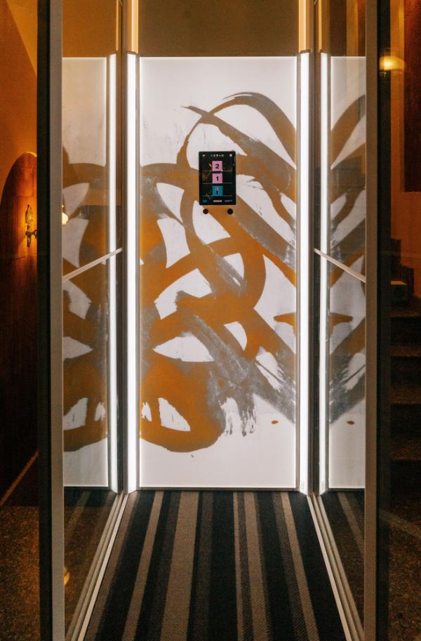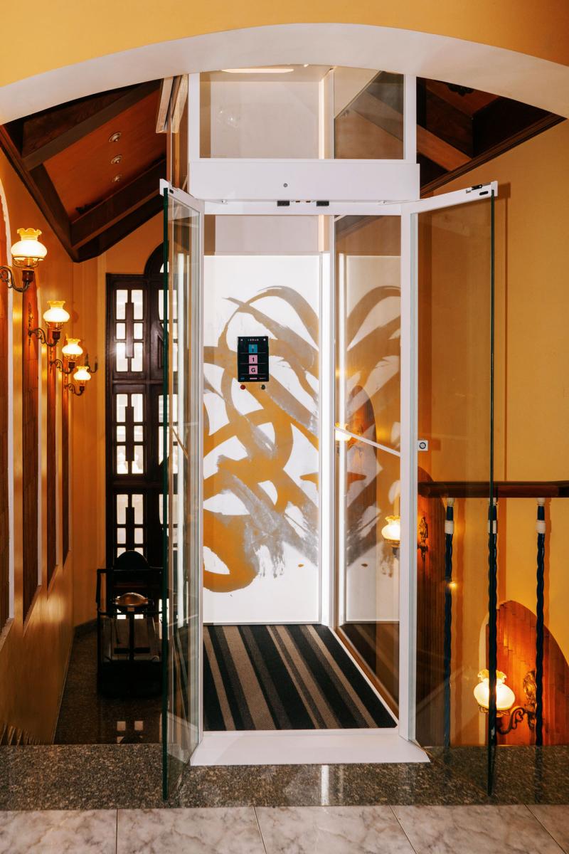 Die Wahl fiel auf einen weißen Swift-Lift, der sich nahtlos in die Ästhetik der Villa integriert. Der Teppichboden von Ege Tæpper und die speziell gestaltete Rückwand in Gold und Bronze verleihen ein luxuriöses Gefühl und schaffen eine perfekte Balance zwischen Tradition und modernem Komfort.