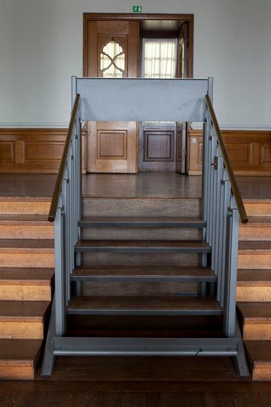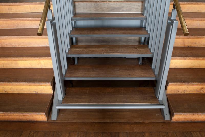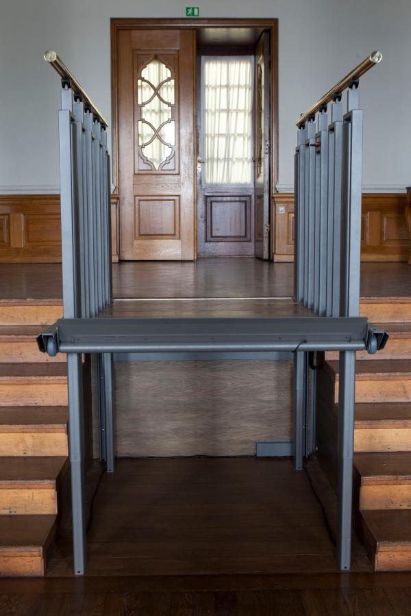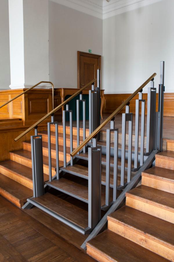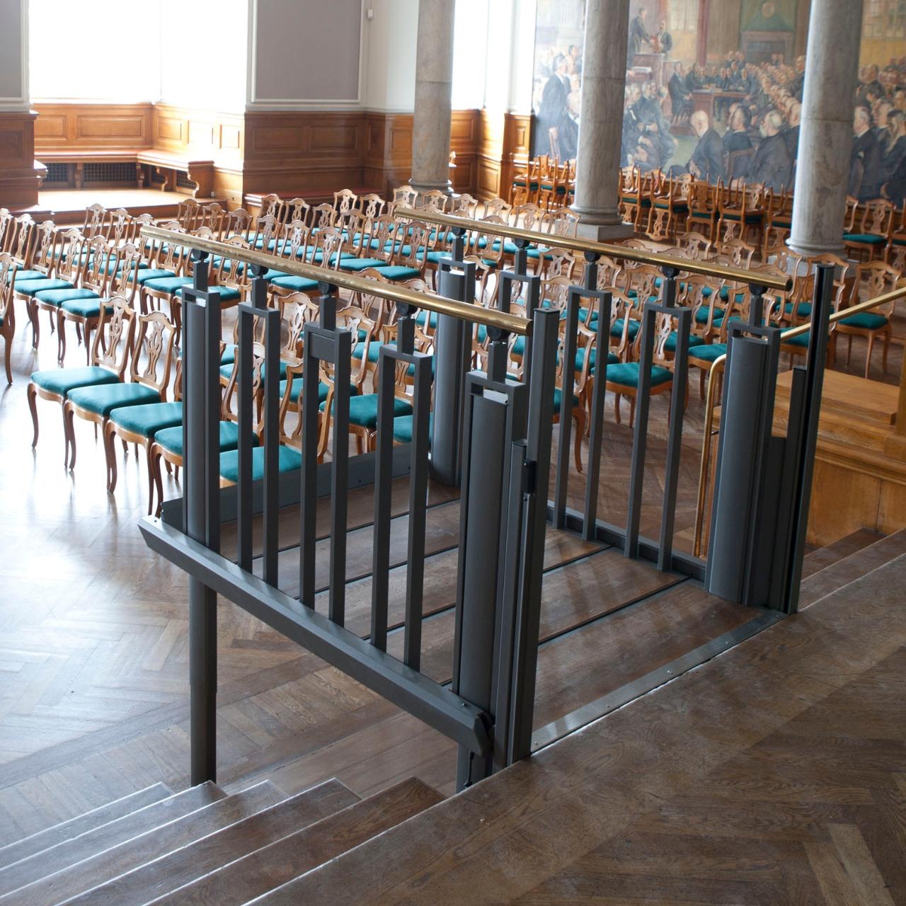 The wide historic staircase 6 steps down to the assembly room was divided with a FlexStep in the middle to create easy access to wheelchair users and walking impaired.