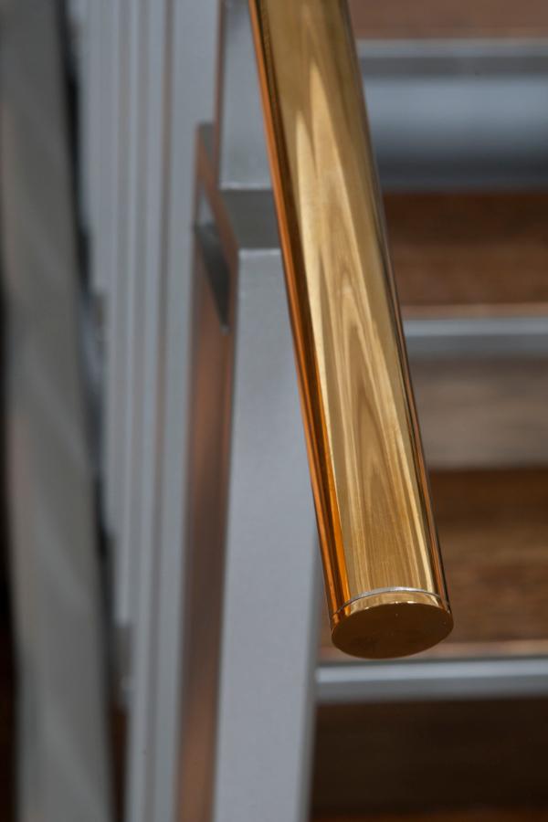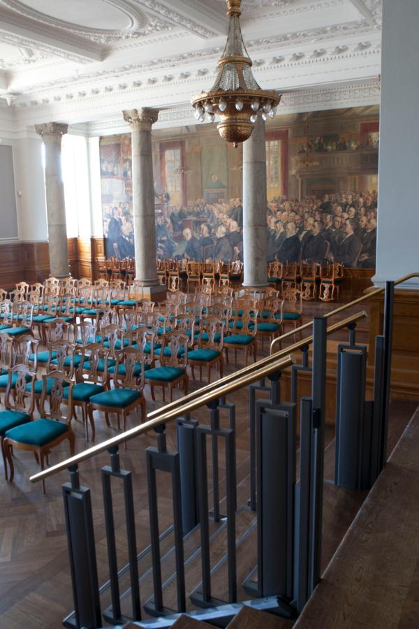 The old floorboard steps were re-used as step inserts and brass handrails were the finishing touch preserving the style and atmosphere in this historic room.