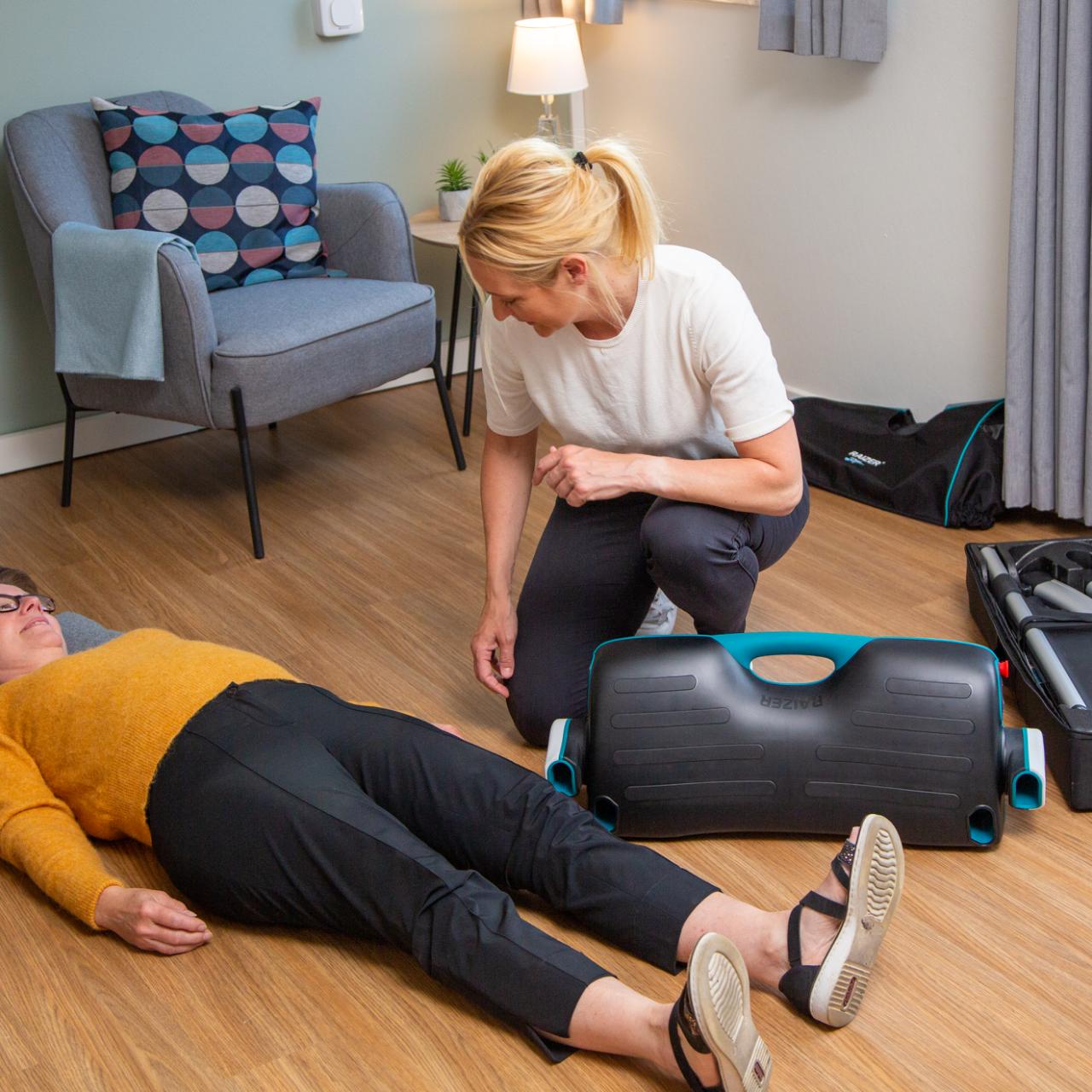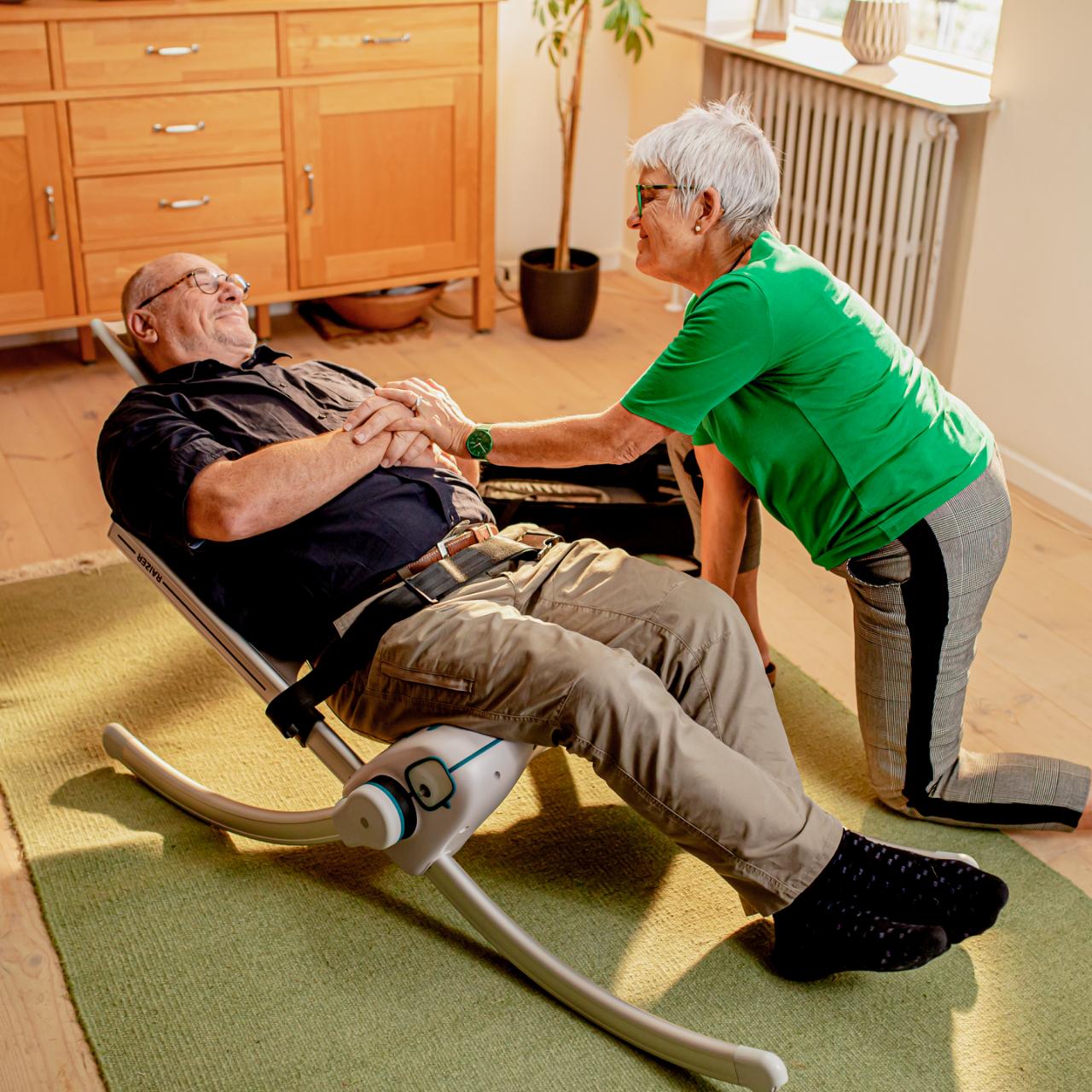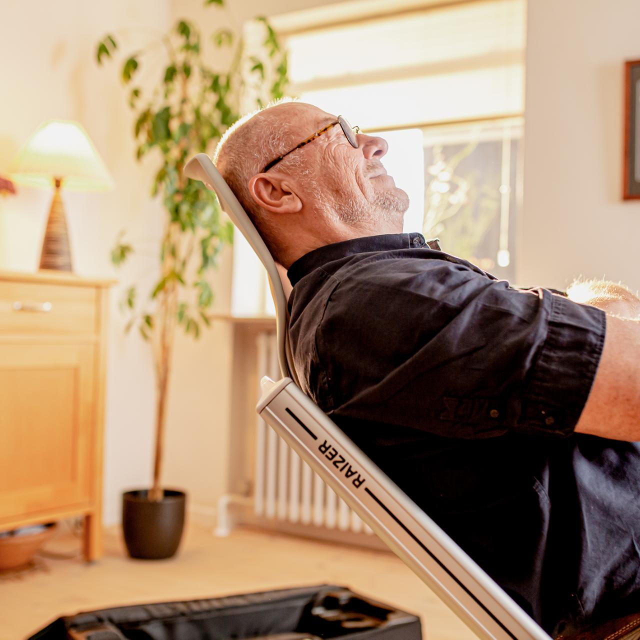 We recommend supporting the neck and head of the person to be lifted as it may be hard to keep the head upright during the lift. In most cases, in connection with the Raizer II lifting chair, we recommend that the helper supports the person’s neck with one hand during the lifting process while simultaneously operating the remote control with the other hand.